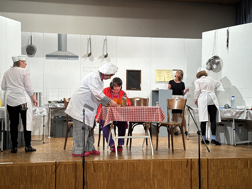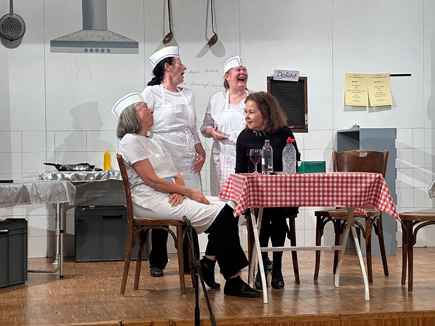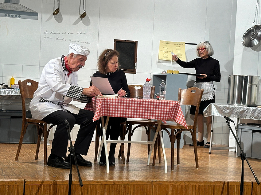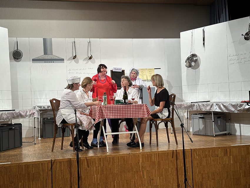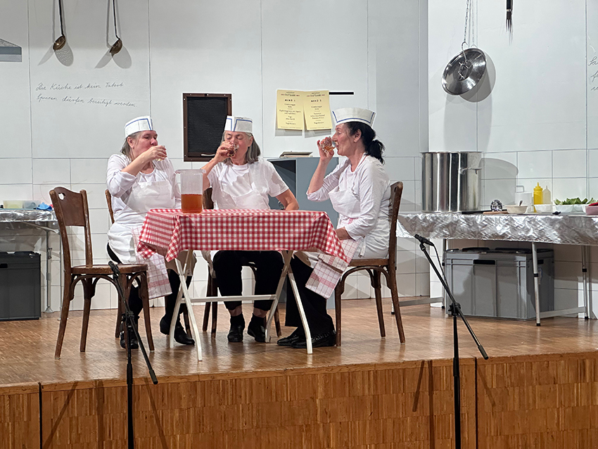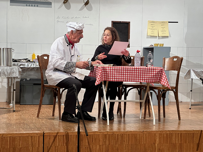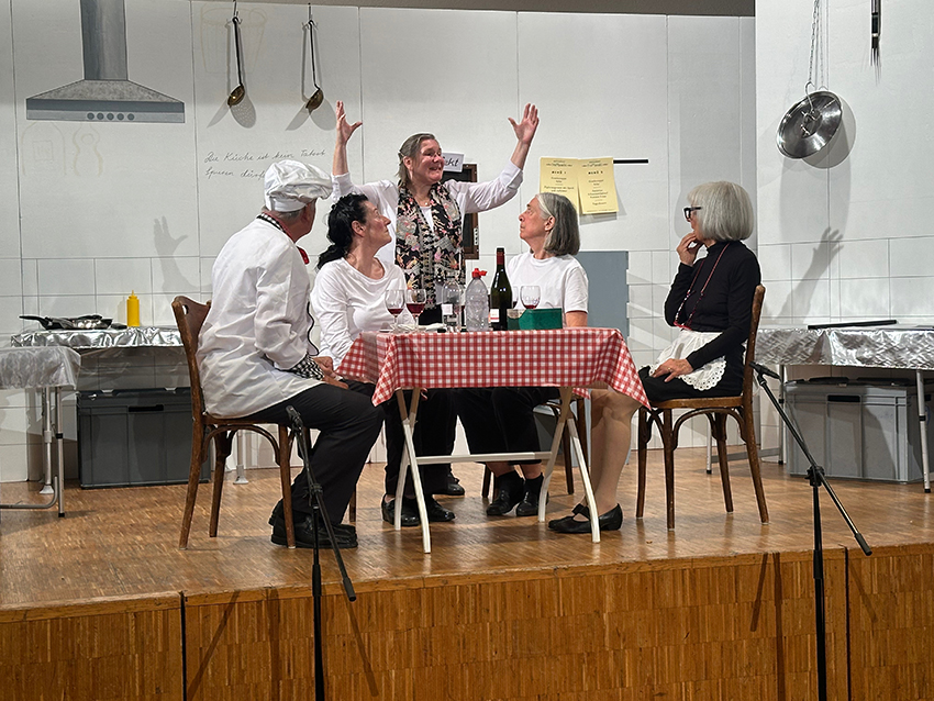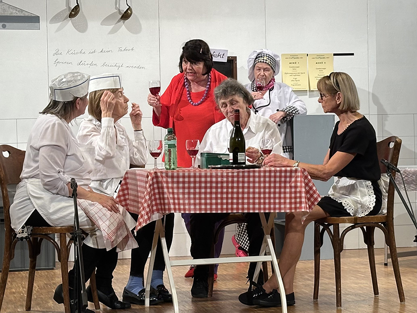 Das Stück, gespielt von charakterstarken Figuren, spielt an einem Dienstagmorgen in der Küche des Restaurants Treffpunkt. Für das Mittagsgeschäft sind in der Gaststube nur wenige Tische reserviert und im Sääli im 1. Stock feiert die Seniorenbühne ihr 50-jähriges Bestehen.
